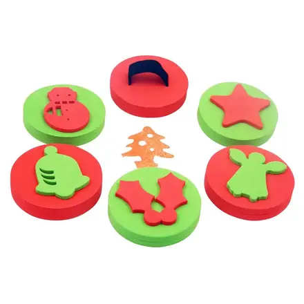 Vzory odtlačiek zahŕňajú snehuliaka, hviezdu, cezmínu, zvonček, anjela a vianočný stromček.